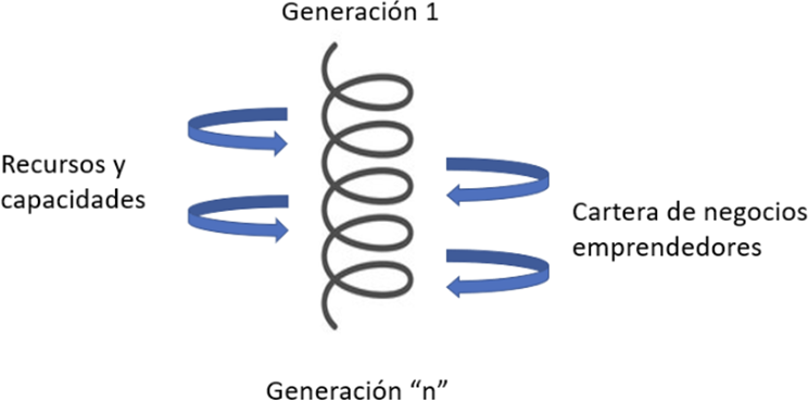 Los “recursos y capacidades” inciden en la cantidad y calidad de los negocios que componen la “cartera familiar de empresas” (Sieger et al., 2011). En este estudio proponemos que también puede suceder a la inversa, donde las empresas de la “cartera” contribuyen a su vez a fortalecer la cantidad y calidad de los “recursos y capacidades” de la familia. Esa relación entre “recursos y capacidades” y “cartera de negocios emprendedores” se produce en ambas direcciones, tal y como se muestra en la Figura 1. Este proceso genera un “efecto espiral” bidireccional mediante el cual los “recursos y capacidades” de la familia y la “cartera de negocios emprendedores” están endógenamente conectados a través de una sucesión intergeneracional. Este proceso se extiende durante décadas alimentando la ventaja competitiva y contribuyendo así a la longevidad de la empresa fundadora y a la de una dinastía emprendedora.