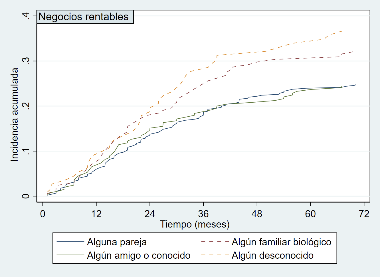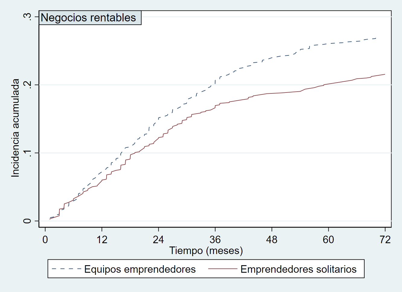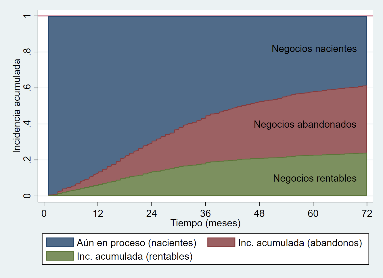 La Figura 1 muestra el patrón general que, dentro del proceso emprendedor, siguen los negocios que son capaces de generar beneficios y aquellos que abandonan por el camino. Al comienzo del proceso emprendedor, como se puede ver, todos los negocios son nacientes ya que están comenzando su andadura y, con el paso del tiempo, algunos consiguen ser rentables, otros abandonan y un determinado porcentaje (bastante importante) siguen siendo nacientes porque no son capaces de generar beneficios de manera sostenida pero tampoco quieran abandonar en el proceso. El porcentaje que muestra la figura puede parecer muy relevante, pero hay que tener en cuenta que una parte de estos negocios son desarrollados por personas que también tienen otras fuentes de ingresos, lo que les permite compaginar la creación de un negocio con otros trabajos. Sí que podemos destacar cómo al final del periodo temporal analizado (tras 72 meses), en torno a un 20% de los negocios son rentables, un 40% han abandonado a lo largo del proceso, y el restante 40% sigue en el proceso de conseguir una empresa rentable.