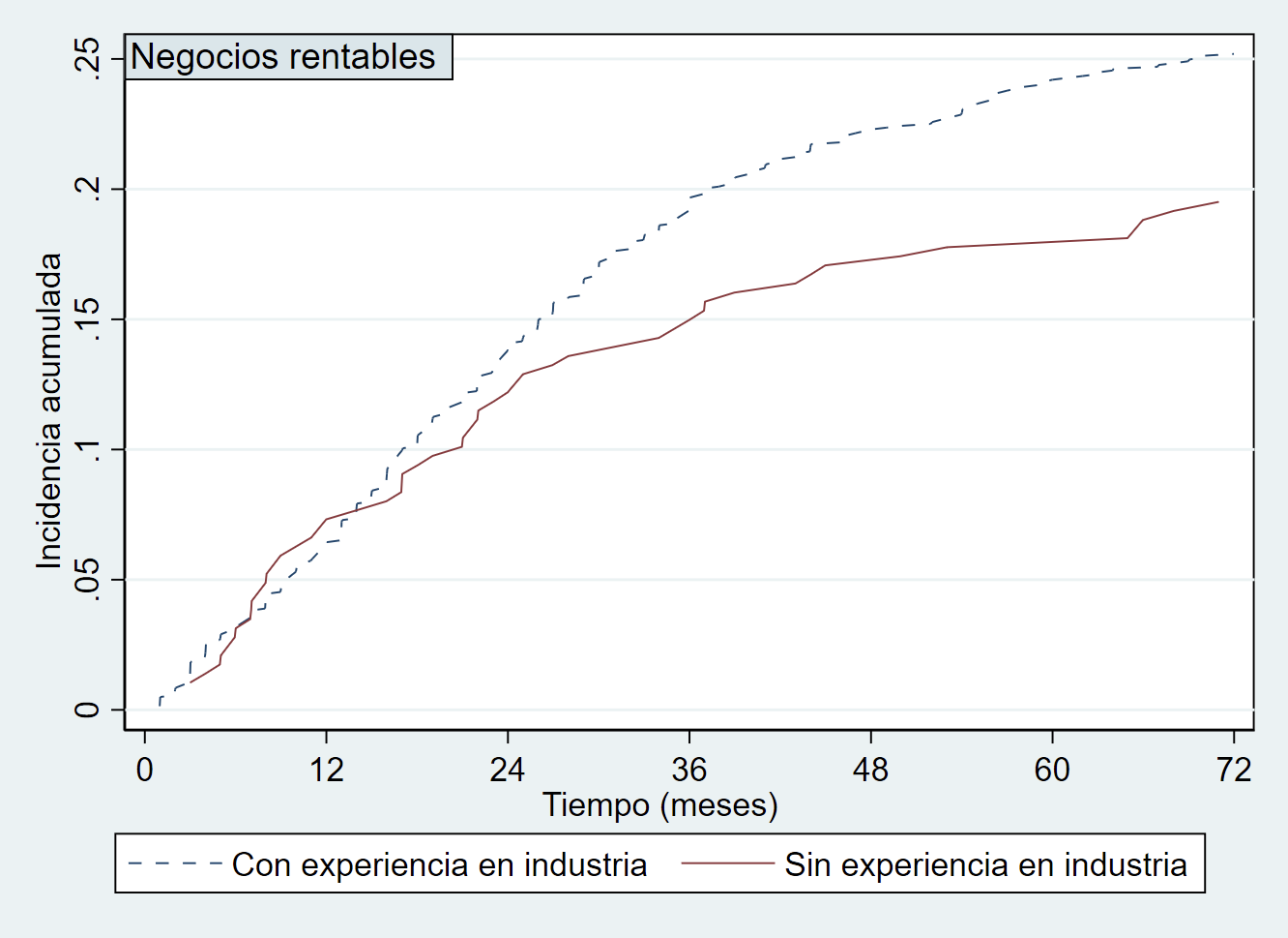 La Figura 3 muestra también la transición de la muestra a negocios rentables dentro del proceso emprendedor, pero diferenciando entre las personas emprendedoras que cuentan con experiencia en la misma industria en la que opera el negocio que se está emprendiendo y aquellas sin experiencia alguna. Como es de esperar, tener experiencia en la industria donde se está creando la empresa resulta muy relevante para tener mayores opciones de éxito y conseguir el resultado deseado en el proceso emprendedor. Las personas emprendedoras con experiencia previa en la industria son más propensas a formar equipos (Pinzón et al., 2022), lo que aporta a estos un mayor conocimiento del mercado, de la forma de satisfacer a los consumidores, o de cómo contactar con proveedores o distribuidores, entre muchas otras ventajas, lo que en definitiva aumenta las opciones de éxito dentro del proceso emprendedor.