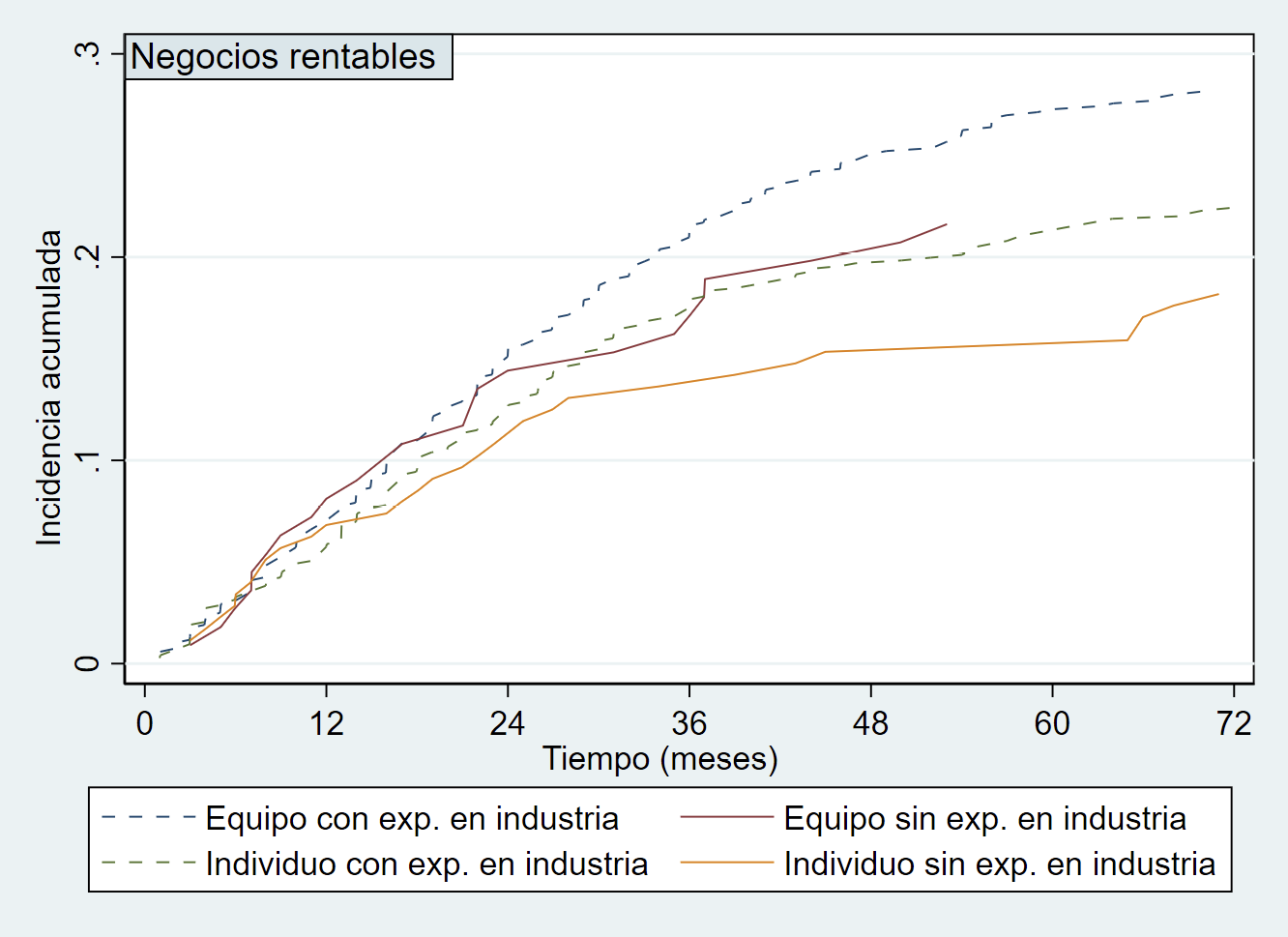 La Figura 4 muestra nuevamente la transición a negocios rentables distinguiendo entre equipos e individuos que emprenden en solitario, pero esta vez teniendo en cuenta si disponen de experiencia previa en la industria o no. Anteriormente, ya se ha visto cómo, en general, los equipos emprendedores suelen rendir en promedio mejor que las personas que emprenden en solitario. Asimismo, independientemente de si emprenden en equipo o en solitario, las personas con experiencia previa en la industria también suelen rendir mejor en el proceso emprendedor que las que no tienen dicha experiencia. Combinando ambas dimensiones, se puede ver cómo los equipos experimentados son los más exitosos, seguidos de los equipos no experimentados y los individuos experimentados, para terminar con los individuos que no tienen experiencia en la industria.