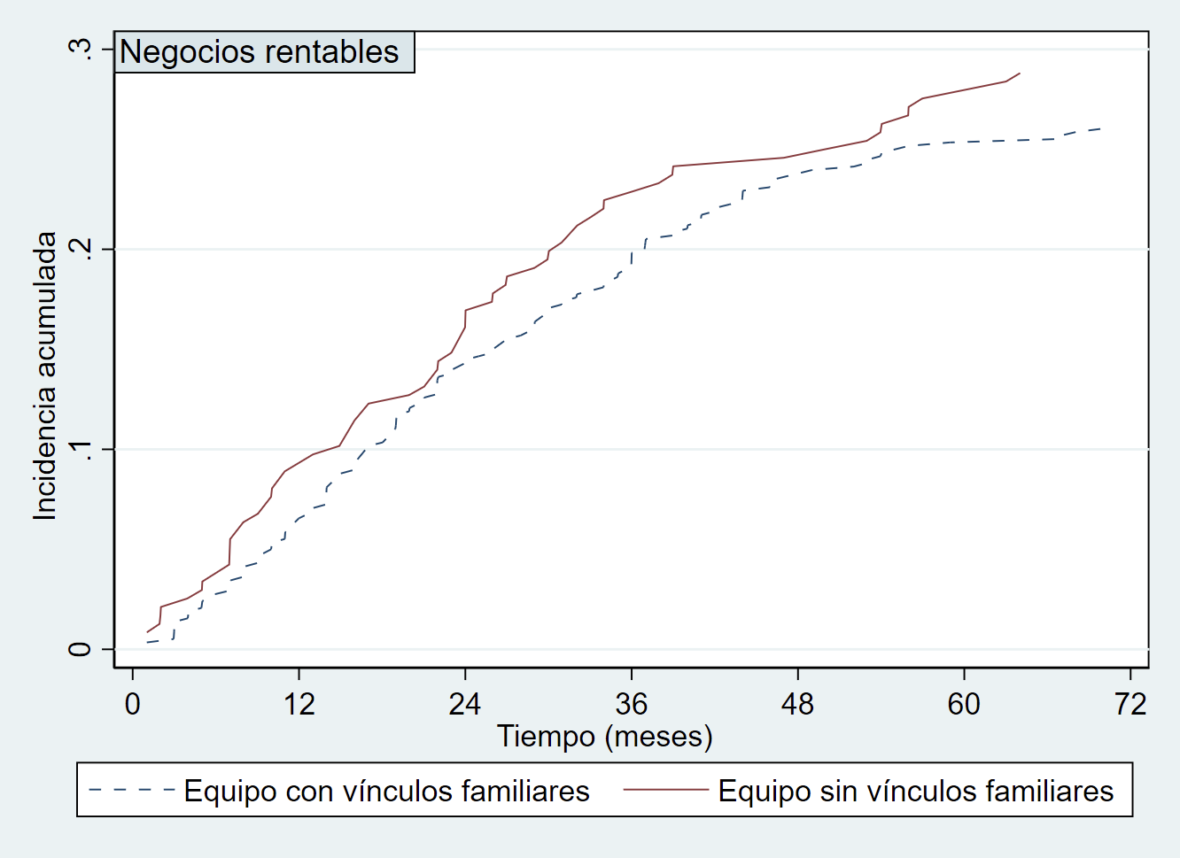 La Figura 5 distingue entre los equipos emprendedores con vínculos familiares y los equipos que no tienen vínculo familiar alguno entre sus miembros. Las diferencias en este caso son menos acentuadas que en los casos anteriores, pero también se puede apreciar cómo los equipos emprendedores sin vínculos familiares son capaces de conseguir que sus negocios tengan beneficios en el mercado en mayor medida que los equipos emprendedores familiares. La existencia de parentescos en los equipos emprendedores puede responder a la homofilia (Ruef et al., 2003), lo que implica que la actitud altruista hacia miembros de la familia influye en la selección de miembros dentro de los equipos emprendedores familiares (Discua Cruz et al., 2013), poniendo a estos en desventaja en comparación con otros equipos en los que la selección de miembros responde a la búsqueda de recursos específicos.