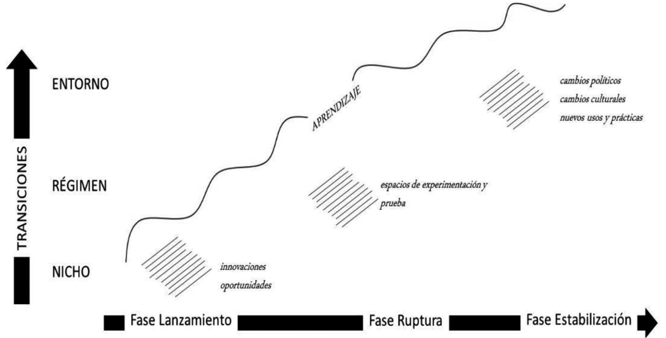 El paso de un sistema sociotécnico a otro sucede en una perspectiva multinivel donde se tienen en cuenta no solo los cambios tecnológicos, sino también los cambios en los procesos, prácticas, políticas, modelos de negocio, formas de consumo y cultura en general, y donde se observan tres niveles básicos: nicho, régimen y entorno (Geels, 2004; Hoogma et al., 2002; Kemp & Rip, 2001). Esta perspectiva multinivel ha sido ampliamente utilizada para analizar transiciones energéticas, de movilidad, en las comunicaciones y en el sector agroalimentario entre otros (Geels, 2019).