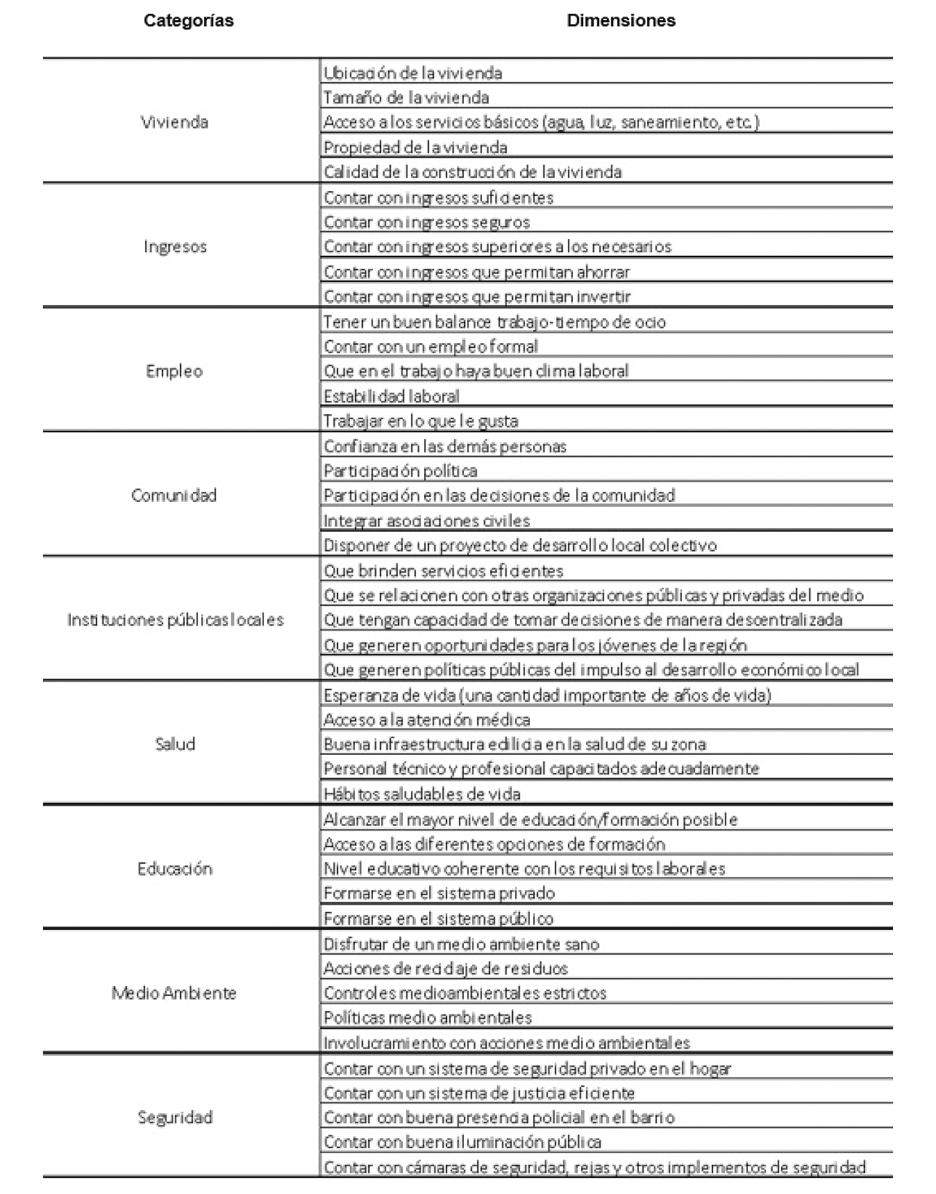 Como ejemplo práctico, en la investigación se evaluó la valoración que se le atribuye en siete diferentes regiones definidas según los criterios de Arocena (2011) a distintas dimensiones de un conjunto de categorías del bienestar objetivo (vivienda, ingresos, empleo, comunidad, instituciones públicas locales, salud, educación, medio ambiente y seguridad). Es decir, tomando en cuenta nueve dimensiones del bienestar objetivo, el estudio investigó si en las diferentes regiones se ponderan de forma distinta sus características para la conformación del bienestar subjetivo o felicidad de las personas. En la siguiente tabla se muestran las distintas características de cada una de las dimensiones económicas que fueron evaluadas.