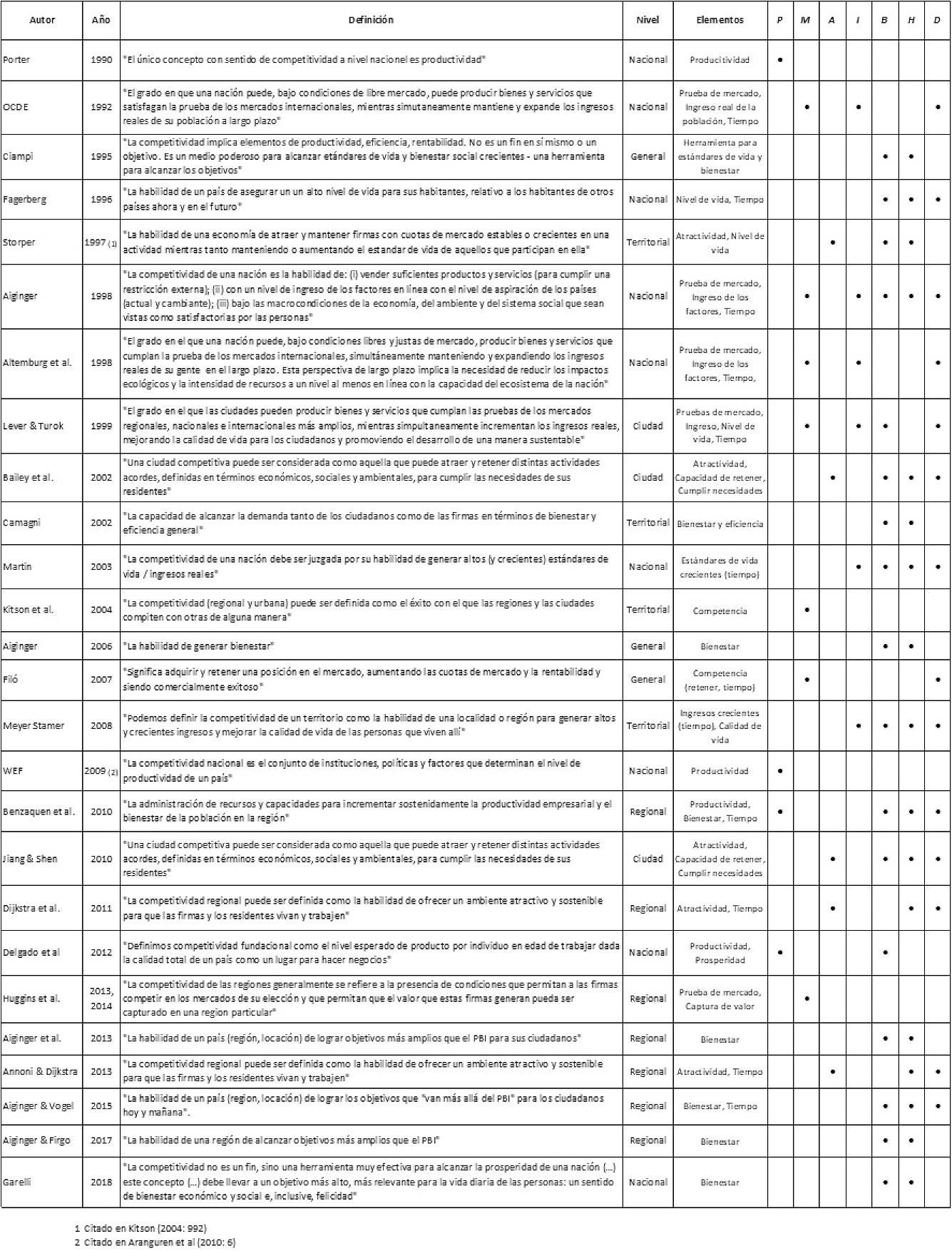 Por otro lado, cuando el término “competitividad” se utiliza para hablar de territorios (regiones, ciudades, países, etc.) el debate se amplía, inclusive llegando a cuestionarse la utilidad del uso del concepto a finales del siglo pasado[1]. Seguramente, tal como planteaba ya Fagerberg (1996) a mediados de la década de los noventa, esto se deba a que el término fue tomado por personas dedicadas a la práctica, cercanas al proceso de construcción de políticas y no por los teóricos. Pero, lo que es cierto es que, a lo largo de los años, el concepto de competitividad fue evolucionando. La tabla que se presenta en el Anexo elaborada en Camacho (2020), a partir de veintiséis definiciones extraídas de una amplia revisión de la literatura sobre la temática de la competitividad, muestra la variedad de visiones sobre el concepto. Se señalan en la tabla para cada una de las definiciones: (i) los factores considerados como parte del concepto de competitividad (productividad, competencia de mercado, atractividad, niveles de ingresos y bienestar); (ii) si el concepto de competitividad se relaciona a un resultado o a una habilidad o proceso; (iii) si la definición incorpora el elemento del tiempo, involucrando características de un concepto dinámico.