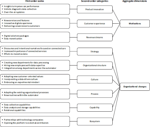 The coding process was carried out in three stages, following the guidelines recommended by Gioia et al. (2013). First, we conducted a thorough reading of the interview transcripts, field notes, and secondary materials to identify empirical evidence related to automakers’ transformation toward connected car business models. Relevant text fragments referring to the context and content of the organizational transformation were coded into 24 first-order codes. These codes were subsequently grouped into nine second-order categories that shared similar ideas. Finally, we organized these second-order categories into two aggregate dimensions based on thematic similarity, which correspond to theoretically grounded constructs: (i) motivations and (ii) organizational changes. Figure 1 presents an overview of the coding structure.